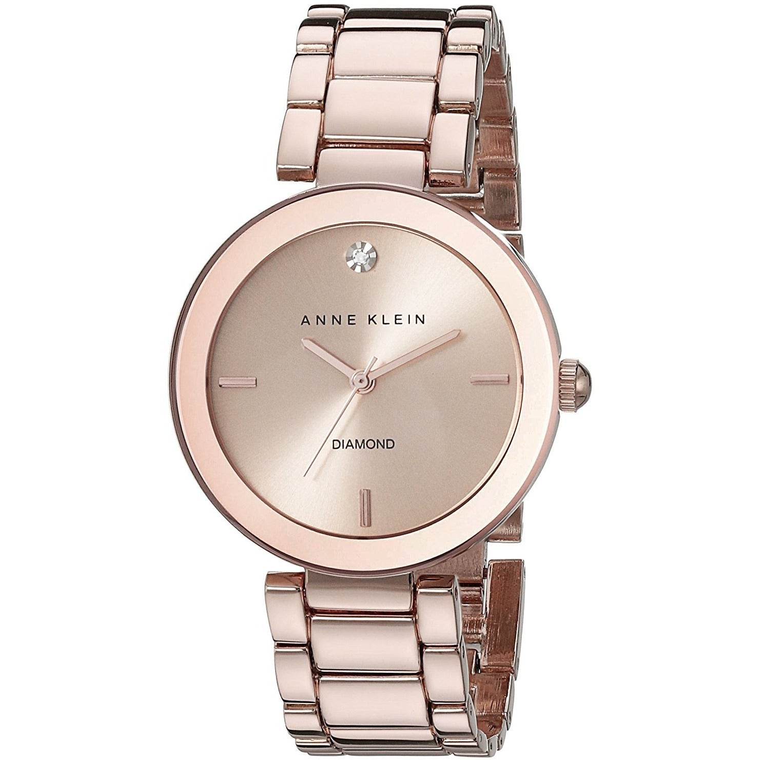 - Rose gold-tone watch featuring round sunray dial with contrast logo and single diamond at 12 o'clock position
